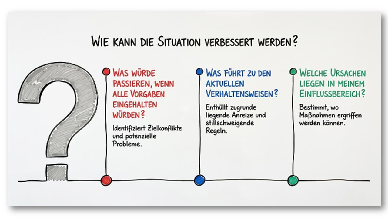 Später vom Fallgeber bestätigt. Damit stand plötzlich ein Zielkonflikt im Raum – und über den hilft weder Disziplin noch Schulungsbedarf weiter. - „Was führt oder verführt die Mitarbeitenden dazu, so zu handeln?“