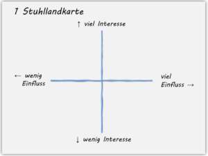 - Zunächst sortierst du deine wichtigsten „Stühle“ (man könnte sie auch Stakeholder nennen) im Fadenkreuz von Interesse und Einfluss.